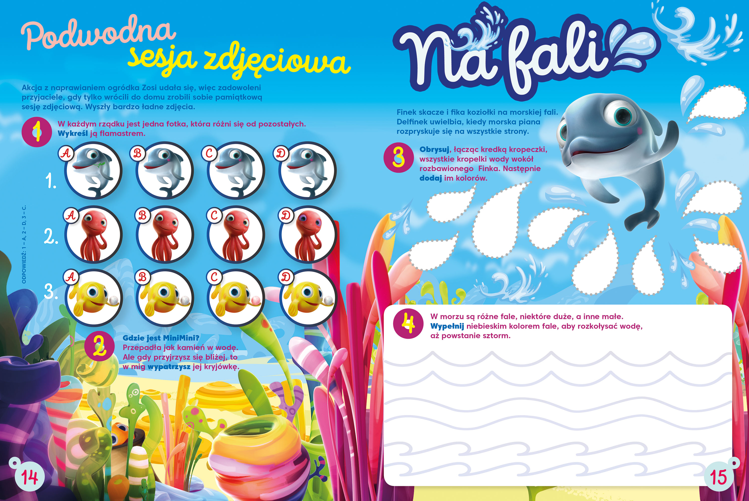 Ten numer Cię rozbawi i zaskoczy! Jest w nim, jak zwykle, wiele zabaw i zadań do wykonania! Na dobry początek Rybka MiniMini opowie Ci o przygodzie z rekinem Ryśkiem. A potem sprawdzisz, czy uważnie słuchałeś jej opowieści. Spotkasz tu się też z innymi lubianymi bohaterami kreskówek. Razem z Łapką Psiuńkiem wpadniesz w odwiedziny do Puszka. Pobawisz się też z psiakami Barbie, a potem poznasz urocze wegezaury i sprawdzisz, który bohater z kreskówki „Oggy, Oggy” może być Twoim przyjacielem. Miłej zabawy!!!